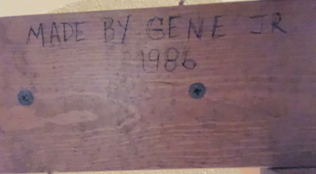 This mystery wood animal with wheels was made by GENE JR. in 1986. Where is Gene Jr. today? Why is his handmade mystery animal here at the Redlands Thrift. Of course I was forced to create a life for Gene in my imagination. He’s doing great. He has no memory of being involved in this woodcarving/building experience (which Dennis believed to be a part of a Scout project). And while the receiver of this masterpiece appreciated it at the time, after awhile it ended up in the attic/basement, then was further buried away to make room for the mid-size rocket Gene Jr. ended up building (because he’s a rocket scientist now).