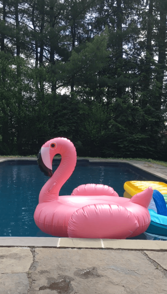 A flamingo roaming free in an upstate NY pool (summer 2017, Stanfordville with a lovely lot of ladies)