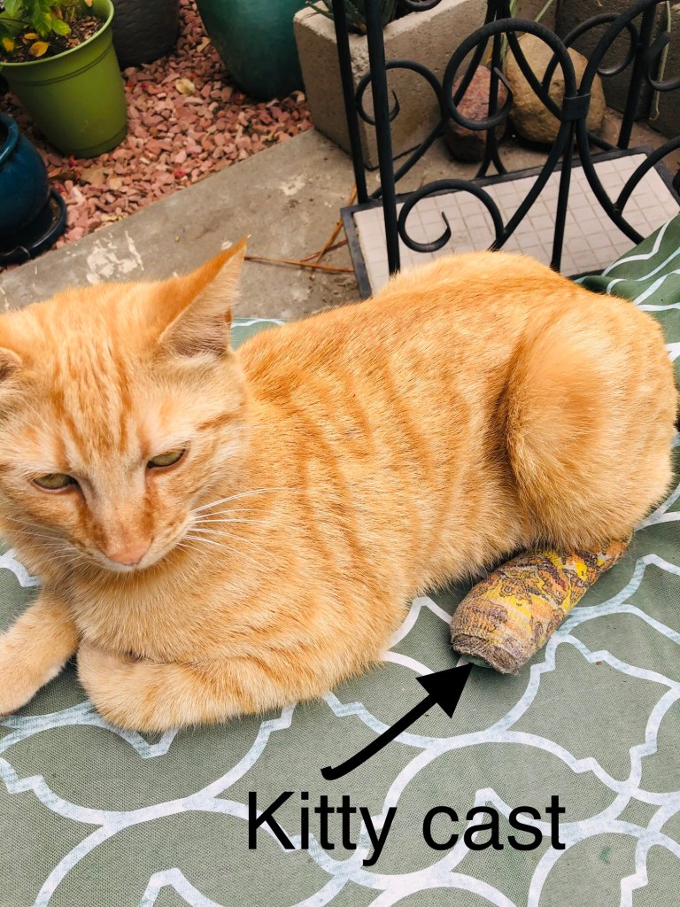 What is? Apparently, a furry creature who doesn’t speak my language gives a good example. Gladimus the cat turned up last week with a cast on her/his leg. Except for shaking it a bit as if it might just pop it off with the effort, Glads is loping along like always. Under the fence, napping on the chaise lounge, running along the sidewalk, chasing things. And when in full flight, the cast tap-taps on the ground like a kitty-fied Ginger Rogers in the catly Rockettes. Vigorous leg shake, tap-tap on the ground, leg shake, tap-tap. What’re you looking at?, she throws me over her shoulder as she heads off to explore the many mysteries of the landscaped bushes. I’ve got this.