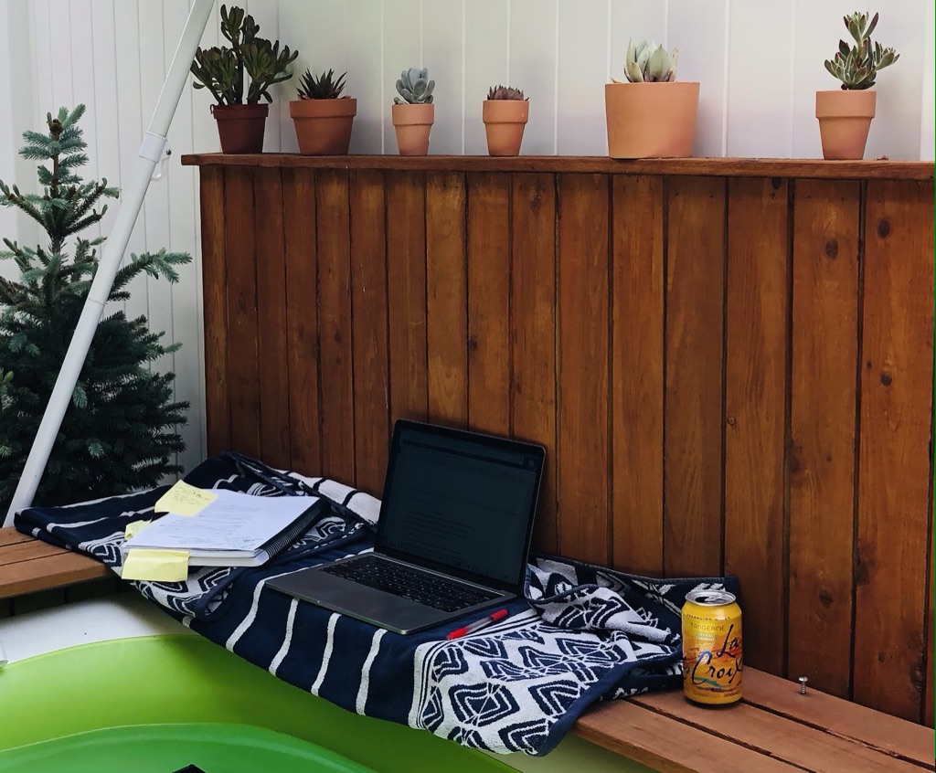 WEDNESDAY: A quiet day started happily with the return of Gladimus community cat. The cast is off her leg (as you can see in the first photo, that back leg has been shaved and looks like a little peg-pirate leg, yet as witnessed in the second photo, she’s on the move as always). She trotted in, let me give he a good pettin’, then headed out to find some shade. I, also in mind of relief, took a brief but vigorous walk around the nabe, listened to a couple of Aria Codes, then came back and settled in, typing in the notations on my novel draft (um, in the pool…where I made a de-facto desk. photo on far right above). Also looked at some final edits on the LA TIMES, LA Affairs piece. I’m lucky to be working with a very cool editor who, even though she had to trim by A LOT, it still reads really well and she didn’t sacrifice all of my darlings. It’s funny to know (pretty) absolutely that it’s happening, since of course I’d gone through all the regular creative doubts in my head: They decided it’s not good enough to publish. It’s not going to run. And on like that. Amazing how I can entertain huge doubts, then tell myself it doesn’t matter if it’s rejected (when of course it does matter), then I hold my emotional breath. Having talked to and read interviews with so many other writers, I know this mindset of doubt is what many many many others have also. Hell, it’s the way of most humans–most especially, it seems, when it comes to ideas and creating.