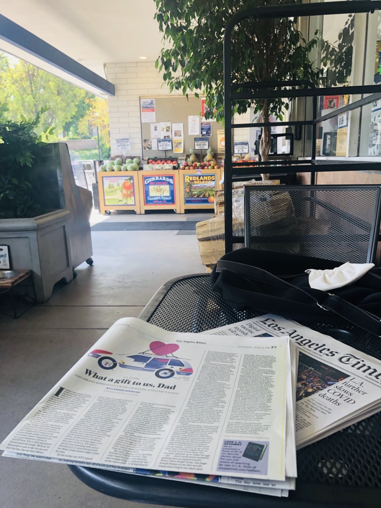 SATURDAY: Hello. A discovery: It’s damn hard to find a brick&mortar that sells actual newspapers. Primarily the LA Times. At the risk of getting sentimental on your a#*, I miss that about NYC. But, to be honest, the newspaper stands in NYC have dwindled quite a bit as well. I did prevail though and found one at a store I had vowed not to go to again because they were pretty lax in their mask mandating during the pandemic. Yet, I walked in and bought two copies of the LA Times anyway. Made me think about how the rules get bent depending on the desire. I’m not proud of it, but at the same time was not relishing a drive into Pasadena (or to a nearby airport) in the Rocket 88 (what we call my dad’s car) in order to secure what I needed. So now…the fun will be to give this to my dad on Father’s Day.