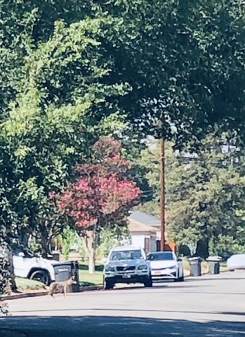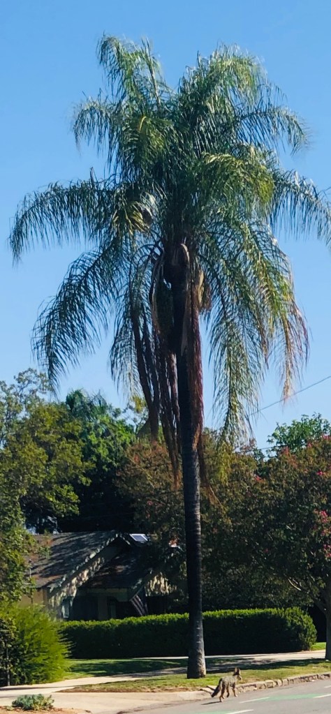 On my morning walk—early to get it in before the H.E.A.T.—I came across some random wildness that jived with where my headspace has been. Things that played into wait-what’s-that-doing-here moments. This was quite helpful in reminding me that you just never do know. That the unexpected can break through into a new view. First off, lost in thought and podcast, I spotted a shaggy four-legger running down Fern Avenue, which is a main, four-lane thoroughfare. I immediately wondered who’d lost their dog until I understood it was not in fact a canine, but a coyote. S/he didn’t look like they were enjoying themselves. Kept looking behind and around with a “what tha?” expression. No, I’m not trained in reading coyote expressions, so that was all a bit of anthropomorphizing. Wiley turned down Buena Vista, a residential street, and so did I. I lost s/he for awhile (I mean, I wasn’t necessarily trying to follow), but as I glanced down a small side street, there W. stood outside a house where there’s a barn-like structure in the backyard. I’m not sure if there are small animals in there, but since no one seemed to be home, I called Redlands animal control just cuz. The lady on the phone said they tranquilize and return all Wileys to the neighboring mountains, so they’d be on the lookout. I had been a bit conflicted about calling and secretly hoped Wiley would find their way back on their own. I did remember from my childhood that coyotes enjoy munching on small animals. (More than a few cats disappeared at night in my childhood Pasadena neighborhood, which was surrounding by foliage and such.) As I walked back around the corner, leaving Wiley behind, there was a woman walking her small dog. I told her about the coyote. She crossed the street and went the opposite way. There was a cat sitting in a driveway. I told him about the coyote. He didn’t care. A mom with her toddler in the front yard was my next target. They got in their car and drove away and I realized I was being a somewhat crazy person and to just carry on with my walk.