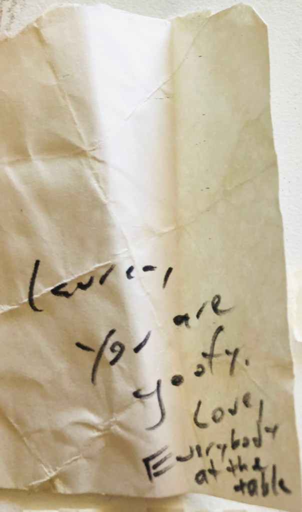 And all went fine, despite the fact I felt I was constantly facing into the kind of industrial fan you’d see at photoshoots to make you think Cindy Crawford’s hair always blew like that. Exhausting. My cheeks aching from grinning or emotional wind chill. As we were putting the finishing touches on the issue, there was a celebratory dinner planned at an Italian restaurant downtown. DaSilvano. It was one of Bob Guccione Jr.’s favorites. We had a long table set up outside for about twenty people and the vibe was to make merry. Over the past weeks, I felt A.Sandler and I had forged a bit of a bond and, truthfully, I had developed a crush, so my flirt reflex was on. Somewhere before the appetizer, after turning back to my place setting from a conversation between one of the other magazine writers and Hal Willner, (RIP) the brilliant sketch music producer for the show, I noticed a slip of paper under my bread plate.