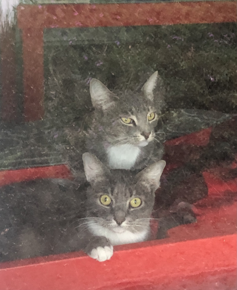 So this exercise in wordage is more a pebble lodged in memory. The picture above, Lucille and Desi through the glass dirtily (need to clean the windows). I’d just come back from a walk, the sun was going down, they were in their favorite window seat that Dennis built them. They don’t altogether understand glass. Why can’t they catch those flying things on the other side of this see-through solid thing? How did you, the person who feeds us and we occasionally let pet us, get out there? Why can’t you clean this thing so we can see better through it. The thing we totally don’t even understand why it exists.