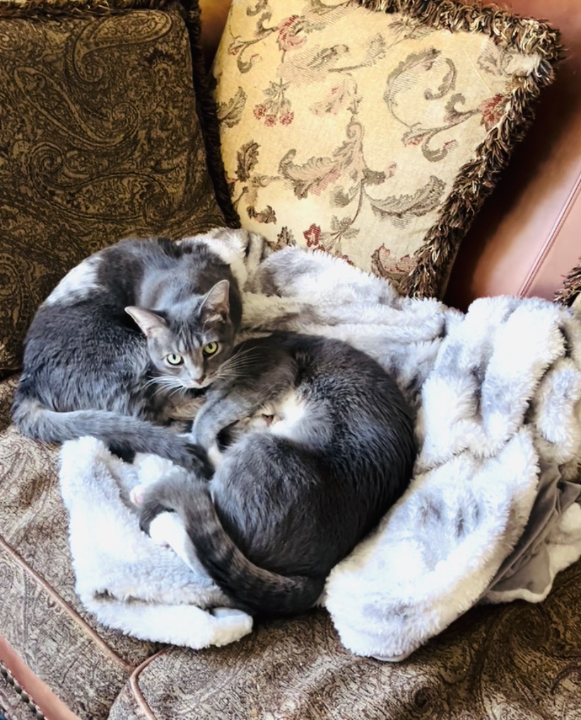 So, yes, they’re living their natural lives, following instincts: chasing when it’s called for, napping when they feel like it, demanding all the things they want (food, human-operated playthings, under-chin and belly scritches). I’m studying this behavior for the human equivalent. I’m pretty sure there’s a parallel to not overthinking it and just infusing my life with a little cat energy. Taking a nap when I feel like it without any guilt. Eating a cookie when it cries out to me (so much easier to just open a package rather than having to chase it down, although packaging these days … am I right?), stepping up to Dennis for a hug and reaching out to all my pals for the verbal equivalent (or the real thing if I’m close enough).