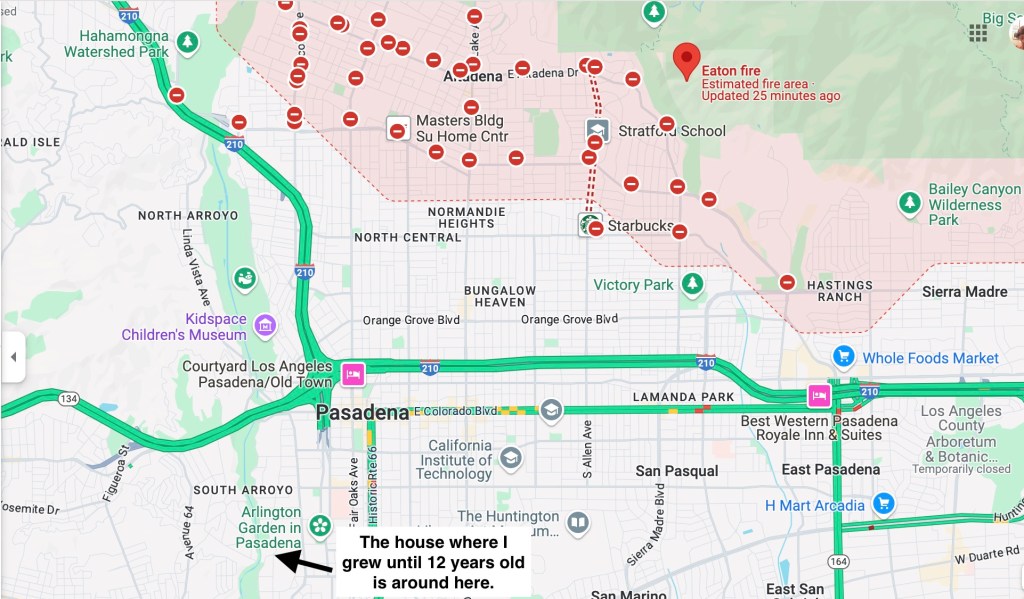 How the Eaton fire is affecting the house I grew up in Pasadena, site of the old Bush Gardens, which was subsequently turned into a neighborhood, is yet to be seen. The flames are not many miles from our old place. I think of the den where the jagged-edged jazz riffs came out of the record player, my dad’s knees drumming, feet thwomping on the thick orange shag as he sat in his Eames chair; the waves of cold sadness echoing through my mom’s silence as she worked in the kitchen on the other side of the house, her voice only occasionally singing along to the top-40 radio, making up words to the hits of the day. I bounced in between and took the feelings in. Then the adrenaline of them splitting up and a move somewhere else, though still in Pasadena. What shakes out when everything falls apart? Once the adrenaline of a moment settles down. I can only speak for me, but it’s ongoing, the things that got buried and the new earth turned making way for fresh growth. Boy does it take time and space for it to happen, along with sensitivity and care. All of those things I’m sending toward each&every currently in need of it.